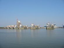 In the early 1980s a massive flood control device, the Thames Barrier, was opened — closed to tides several times a year to prevent water damage to London's low-lying areas upstream (as in the 1928 Thames flood for example). In the late 1990s, the 7-mile (11 km) long Jubilee River was built as a flood channel for the Thames around Maidenhead and Windsor.