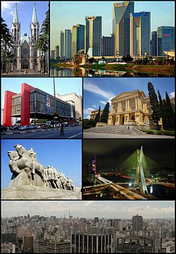 | Photo montage of the city of São Paulo. From the top, left to right: São Paulo Cathedral; United Nations Business Centre; São Paulo Museum of Art on Paulista Avenue; Museum of Ipiranga; Bandeiras Monument; Octávio Frias de Oliveira Bridge; and downtown skyline from Altino Arantes Building. | |||