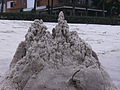 Sand grains will not stick together unless the sand is reasonably fine. While dry sand is loose, wet sand is adherent if the proper amounts of sand and water are used in the mixture. The reason for this is that water forms little ‘bridges’ between the grains of sand when it is damp due to the forces of surface tension. However, if too much water is added the water fills the spaces between the grains, breaking down the bridges and thus lowering the surface tension, resulting in the sand being able to flow more easily and the structure collapsing. According to the BBC TV programme Coast, the ideal ratio is eight parts dry sand to one part water, (though this may depend on the type of sand). However, recent research has found that the optimal sand-water mix for building sandcastles contains 1% water by volume. (The same researchers also found that it is possible to build sandcastles underwater.)