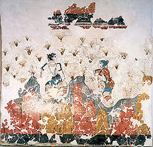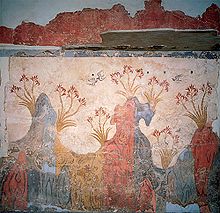 Fragmentary wall-paintings at Akrotiri lack the insistent religious or mythological content familiar in Classical Greek décor. Instead, the Minoan frescoes depict "Saffron-Gatherers", who offer their crocus-stamens to a seated lady, perhaps a goddess. Crocus has been discovered to have many medicinal values including the relief of menstrual pain. This has led many archaeologists to believe that the fresco of the saffron/crocus gatherers is a coming of age fresco dealing with female pubescence. In another house are two antelopes, painted with a kind of confident, flowing, decorative, calligraphic line, the famous fresco of a fisherman with his double strings of fish strung by their gills, and the flotilla of pleasure boats, accompanied by leaping dolphins, where ladies take their ease in the shade of light canopies, among other frescoes.