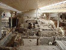 Excavations starting in 1967 at the site called Akrotiri under the late Professor Spyridon Marinatos have made Thera the best-known Minoan site outside of Crete, the homeland of the culture. The island was not known as Thera at this time. Only the southern tip of a large town has been uncovered, yet it has revealed complexes of multi-level buildings, streets, and squares with remains of walls standing as high as eight metres, all entombed in the solidified ash of the famous eruption of Thera. The site was not a palace-complex such as are found in Crete, but its excellent masonry and fine wall-paintings show that this was certainly no conglomeration of merchants' warehousing either. A loom-workshop suggests organized textile weaving for export. This Bronze Age civilization thrived between 3000 to 2000 BC, and reached its peak in the period 2000 to 1580 BC.