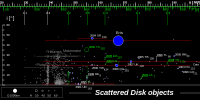 The scattered disc (or scattered disk) is a distant region of the Solar System that is sparsely populated by icy minor planets, a subset of the broader family of trans-Neptunian objects. The scattered-disc objects (SDOs) have orbital eccentricities ranging as high as 0.8, inclinations as high as 40°, and perihelia greater than 30 astronomical units (4.5×109 km; 2.8×109 mi). These extreme orbits are believed to be the result of gravitational "scattering" by the gas giants, and the objects continue to be subject to perturbation by the planet Neptune. While the nearest distance to the Sun approached by scattered objects is about 30–35 AU, their orbits can extend well beyond 100 AU. This makes scattered objects "among the most distant and cold objects in the Solar System". The innermost portion of the scattered disc overlaps with a torus-shaped region of orbiting objects traditionally called the Kuiper belt, but its outer limits reach much farther away from the Sun and farther above and below the ecliptic than the belt proper.