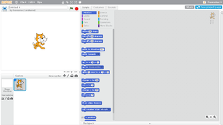 The user interface for the Scratch development environment divides the screen into several panes: on the left is the blocks palette, in the middle the current sprite info and scripts area, and on the right the stage (backgrounds) and "sprites" list.