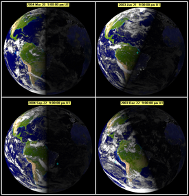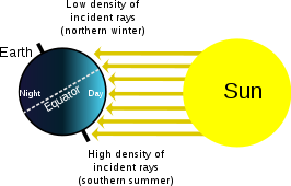 The seasons result from the Earth's axis being tilted to its orbital plane; it deviates by an angle of approximately 23.5 degrees. Thus, at any given time during summer or winter, one part of the planet is more directly exposed to the rays of the Sun (see Fig. 1). This exposure alternates as the Earth revolves in its orbit. Therefore, at any given time, regardless of season, the northern and southern hemispheres experience opposite seasons.