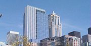Washington Mutual's last headquarters, the WaMu Center, (now the Chase Centre and soon to be Russell Investments Center) (centre left) and its headquarters prior, Washington Mutual Tower (centre right).