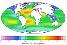 Ocean salinity has been stable for billions of years, most likely as a consequence of a chemical/tectonic system which removes as much salt as is deposited; for instance, sodium and chloride sinks include evaporite deposits, pore water burial, and reactions with seafloor basalts.
