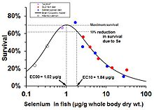 In fish and other wildlife, low levels of selenium cause deficiency while high levels cause toxicity. For example, in salmon, the optimal concentration of selenium in the fish tissue (whole body) is about 1 microgram selenium per gram of tissue (dry weight). At levels much below that concentration, young salmon die from selenium deficiency; much above that level they die from toxic excess.