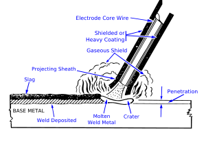 Shielded metal arc welding (SMAW), also known as manual metal arc welding (MMA or MMAW), flux shielded arc welding or informally as stick welding, is a manual arc welding process that uses a consumable electrode coated in flux to lay the weld. An electric current, in the form of either alternating current or direct current from a welding power supply, is used to form an electric arc between the electrode and the metals to be joined. As the weld is laid, the flux coating of the electrode disintegrates, giving off vapors that serve as a shielding gas and providing a layer of slag, both of which protect the weld area from atmospheric contamination.