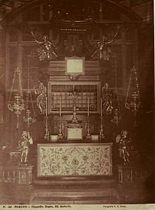 The history of the shroud from the 15th century is well recorded. In 1532, the shroud suffered damage from a fire in a chapel of Chambéry, capital of the Savoy region, where it was stored. A drop of molten silver from the reliquary produced a symmetrically placed mark through the layers of the folded cloth. Poor Clare Nuns attempted to repair this damage with patches. In 1578 Emmanuel Philibert, Duke of Savoy ordered the cloth to be brought from Chambéry to Turin and it has remained at Turin ever since.