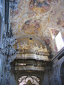 The Church of San Benedetto in Catania (Illustrations 15 and 16) is a fine example of a Sicilian Baroque interior, decorated between 1726 and 1762, the period when Sicilian Baroque was at the height of its fashion and individuality. The ceilings were frescoed by the artist Giovanni Tuccari. The most spectacular part of the church's decoration is the nun's choir (Illustrations 16), created c. 1750, which was designed in such a way that the nuns' voices could be heard during services, but the nuns themselves were still quite separate from and unseen by the less spiritual world outside.