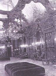 As in the rest of Italy, the finest and most decorated rooms were those on the piano nobile, reserved for guests and entertaining. Entered formally from the external Baroque double staircase, these rooms consisted of a suite of large and small salons, with one very large salon being the principal room of the house, often used as a ballroom. Sometimes the guest bedrooms were sited here too, but by the end of the 18th century they were more often on a secondary floor above. If decorated during the Baroque era, the rooms would be profusely ornamented. Walls were frequently mirrored, the mirrors inset into gilded frames in the walls, often alternating with paintings similarly framed, while moulded nymphs and shepherdesses decorated the spaces between. Ceilings were high and frescoed, and from the ceiling hung huge coloured chandeliers of Murano glass, while further light came from gilded sconces flanking the mirrors adorning the walls. One of the most notable rooms in this style is the Gallery of Mirrors in Palermo's Palazzo Valguarnera-Gangi (Illustration 17). This room with its frescoed ceiling by Gaspare Fumagalli is, however, one of the few Baroque rooms in this Baroque palazzo, which was (from 1750) extended and transformed by its owner Marianna Valguarnera, mostly in the later neoclassical style.
