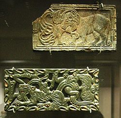 Following contacts of metropolitan China with nomadic western border territories in the 8th century BC, gold was introduced from Central Asia, and Hotan Kashteshi Hotan jade carvers began to make imitation designs of the steppes, adopting the Scythian-style animal art of the steppes (depictions of animals locked in combat). This style is particularly reflected in the rectangular belt plaques made of gold and bronze with alternate versions in jade and steatite.