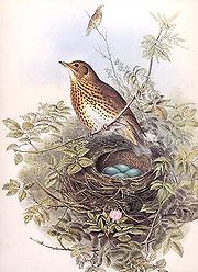 The Song Thrush (Turdus philomelos) is a thrush that breeds across much of Eurasia. It is also known in English dialects as throstle or mavis. It has brown upperparts and black-spotted cream or buff underparts and has three recognised subspecies. Its distinctive song, which has repeated musical phrases, has frequently been referred to in poetry.
