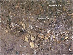Soweto is a lower middle class populated urban area of the city of Johannesburg in Gauteng, South Africa, bordering the city's mining belt in the south. Its name is an English syllabic abbreviation for South Western Townships. Formerly a separate municipality, it is now incorporated in the City of Johannesburg Metropolitan Municipality, Suburbs of Johannesburg.