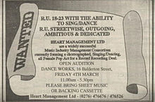In the mid-1990s, family management team Bob Herbert, Chris Herbert and Lindsey Casbon set about creating a girl group to compete with popular boy bands that dominated the pop music scene in the mid- to late-1990s: "The whole teen-band scene at the time was saturated by boy bands like Take That and East 17. That was all a bit of a yawn for me, and only appealed to female audiences...I felt if you could appeal to the boys as well, you'd be laughing." In February 1994, Heart Management – which comprised the Herberts together with financier Chic Murphy – placed an advertisement in The Stage trade magazine asking "WANTED: R.U. 18–23 with the ability to sing/dance? R.U. streetwise, outgoing, ambitious, and dedicated? Heart Management Ltd. are a widely successful music industry management consortium currently forming a choreographed, singing/dancing, all-female pop act for a recording deal. Open audition. Danceworks, 16 Balderton Street. Friday 4 March. 11 am-5:30 pm. Please bring sheet music or backing cassette". About 400 women who answered the ad went to Dance Works studios. There, they were put into groups of 10 and danced a routine to "Stay" by Eternal. After that, the selection continued and the girls had to sing solo songs. Victoria Adams sang "Mein Herr", Melanie Brown sang " Greatest Love of All", Melanie Chisholm sang " I'm So Excited", Michelle Stephenson sang " Don't Be a Stranger". After the auditions, the women returned home and waited for some weeks. Geri Halliwell had seen the ad but went skiing in Spain and missed the audition because her face got sunburnt.