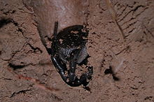 The Mygalomorphae, which first appeared in the Triassic period, are generally heavily built and hairy, with large, robust chelicerae and fangs. Well-known examples include tarantulas, trapdoor spiders and the Australasian funnel-web spiders. Most spend the majority of their time in burrows, and some run silk tripwires out from these, but a few build webs to capture prey. However mygalomorphs cannot produce the pirifom silk that the Araneomorphae use as instant adhesive to glue silk to surfaces or to other strands of silk, and this makes web construction more difficult for mygalomorphs. Since mygalomorphs rarely "balloon" by using air currents for transport, their populations often form clumps. In addition to arthropods, mygalomorphs prey on frogs and lizards, and snails.