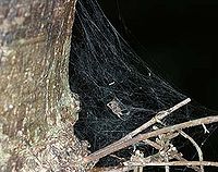 Members of the family Theridiidae weave irregular, tangled, three-dimensional webs, popularly known as cobwebs. There seems to be an evolutionary trend towards a reduction in the amount of sticky silk used, leading to its total absence in some species. The construction of cobwebs is less stereotyped than that of orb-webs, and may take several days.