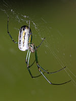 Only three classes of pigment ( ommochromes, bilins and guanine) have been identified in spiders, although other pigments have been detected but not yet characterized. Melanins, carotenoids and pterins, very common in other animals, are apparently absent. In some species the exocuticle of the legs and prosoma is modified by a tanning process, resulting in brown coloration. Bilins are found, for example, in Micrommata virescens, resulting in its green colour. Guanine is responsible for the white markings of the European garden spider Araneus diadematus. It is in many species accumulated in specialized cells called guanocytes. In genera such as Tetragnatha, Leucauge, Argyrodes or Theridiosoma, guanine creates their silvery appearance. While guanine is originally an end-product of protein metabolism, its excretion can be blocked in spiders, leading to an increase in its storage. Structural colors occur in some species, which are the result of the diffraction, scattering or interference of light, for example by modified setae or scales. The white prosoma of Argiope results from hairs reflecting the light, Lycosa and Josa both have areas of modified cuticle that act as light reflectors.