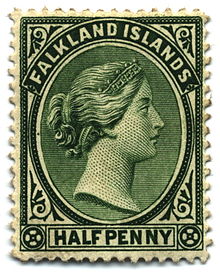 The first postage stamp, the Penny Black, was issued by Britain in 1840 and pictured a young Queen Victoria. It was produced without perforations (imperforate) and consequently had to be cut from the sheet with scissors in order to be used. While unused examples of the "Penny Black" are quite scarce, used examples are quite common, and may be purchased for $20 to $200, depending upon condition.