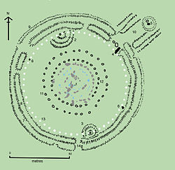 The first monument consisted of a circular bank and ditch enclosure made of Late Cretaceous ( Santonian Age) Seaford Chalk, (7 and 8) measuring around 110 metres (360 ft) in diameter with a large entrance to the north east and a smaller one to the south (14). It stood in open grassland on a slightly sloping but not especially remarkable spot. The builders placed the bones of deer and oxen in the bottom of the ditch as well as some worked flint tools. The bones were considerably older than the antler picks used to dig the ditch and the people who buried them had looked after them for some time prior to burial. The ditch itself was continuous but had been dug in sections, like the ditches of the earlier causewayed enclosures in the area. The chalk dug from the ditch was piled up to form the bank. This first stage is dated to around 3100 BC after which the ditch began to silt up naturally and was not cleared out by the builders. Within the outer edge of the enclosed area was dug a circle of 56 pits, each around 1 metre (3.3 ft) in diameter (13), known as the Aubrey holes after John Aubrey, the seventeenth century antiquarian who was thought to have first identified them. The pits may have contained standing timbers, creating a timber circle although there is no excavated evidence of them. A small outer bank beyond the ditch could also date to this period.