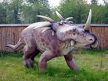 Styracosaurus (pron.: / s t ɨ ˌ r æ k ə ˈ s ɔr ə s / stə-RAK-ə-SOR-əs; meaning "spiked lizard" from the Ancient Greek styrax/στύραξ "spike at the butt-end of a spear-shaft" and sauros/ σαῦρος "lizard") was a genus of herbivorous ceratopsian dinosaur from the Cretaceous Period ( Campanian stage), about 76.5 to 75.0 million years ago. It had four to six long horns extending from its neck frill, a smaller horn on each of its cheeks, and a single horn protruding from its nose, which may have been up to 60 centimetres (2 ft) long and 15 centimetres (6 in) wide. The function or functions of the horns and frills have been debated for many years.