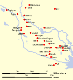 Apart from Mari, which lies full 330 km (205 mi) northwest of Agade, but which is credited in the king list as having “exercised kingship” in the Early Dynastic II period, and Nagar, an outpost, these cities are all in the Euphrates-Tigris alluvial plain, south of Baghdad in what are now the Bābil, Diyala, Wāsit, Dhi Qar, Basra, Al-Muthannā and Al-Qādisiyyah governorates of Iraq.