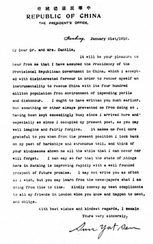 Letter from Sun Yat-sen to James Cantlie announcing to him that he has assumed the Presidency of the Provisional Republican Government of China. Dated 21 January 1912.