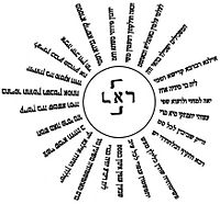An unusual swastika, composed of the Hebrew letters Aleph and Resh, appears in the 18th century Kabbalistic work "Parashat Eliezer" by Rabbi Eliezer Fischl of Strizhov, a commentary on the medieval European Jewish eschatological book "Karnayim", ascribed to Rabbi Aharon of Kardina. The symbol is enclosed by a circle and surrounded by a cyclic hymn in Aramaic. The hymn, which refers explicitly to the power of the Sun, as well as the shape of the symbol, shows strong solar symbolism. According to the book, this mandala-like symbol is meant to help a mystic to contemplate on the cyclic nature and structure of the Universe. The letters are the initial and final characters of the Hebrew word, אוֹר, or "light".