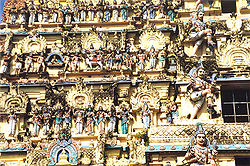 Tamil temples were often simply treated as sculptures on a grand scale. The temples are most notable for their high spires, known as Gopura, consisting of a number of stepped levels, and the vimanam, which rises above the sanctum sanctorum. During the Chola period, the vimanams had more prominence, as seen in the Brihadīsvara temple of Thanjavur. During the Nayak period, the spires became progressively more elaborate and ornate, as exemplified by the Meenakshi Temple in Madurai, while the vimanam became much smaller. From the 13th century onwards, the entrance gates to the temples, called gopurams in Tamil, also began to grow bigger, and more elaborate. The temples at Chidambaram and Srirangam have particularly impressive gopurams, covered with sculptures and reliefs of various scenes and characters from Hindu mythology.