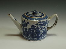 From the end of the 17th century tea was shipped from China to Europe as part of the export of exotic spices and luxury goods. The ships that brought the tea also carried porcelain teapots. The majority of these teapots were painted in blue and white underglaze. Porcelain being completely vitrified will withstand sea water without damage, so the teapots were packed below deck whilst the tea stayed on top in the dry.