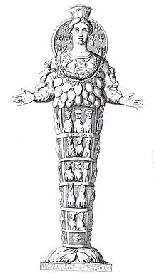 Artemis was a Greek goddess, the virginal huntress and twin of Apollo, who supplanted the Titan Selene as goddess of the Moon. Of the Olympian goddesses who inherited aspects of the Great goddess of Crete, Athene was more honored than Artemis at Athens. At Ephesus, a goddess whom the Greeks associated with Artemis was passionately venerated in an archaic, certainly pre-Hellenic cult image that was carved of wood and kept decorated with jewelry. Robert Fleischer identified as decorations of the primitive xoanon the changeable features that since Minucius Felix and Jerome's Christian attacks on pagan popular religion had been read as many breasts or "eggs" — denoting her fertility. Most similar to Near-Eastern and Egyptian deities, and least similar to Greek ones, her body and legs are enclosed within a tapering pillar-like term, from which her feet protrude. On the coins minted at Ephesus, the apparently many-breasted goddess wears a mural crown (like a city's walls), an attribute of Cybele (see polos). On the coins she rests either arm on a staff formed of entwined serpents or of a stack of ouroboroi, the eternal serpent with its tail in its mouth. Something the Lady of Ephesus had in common with Cybele was that each was served by temple slave-women, or hierodules (hiero "holy", doule "female slave"), under the direction of a priestess who inherited her role, attended by a college of eunuch priests called "Megabyzoi" (though sometimes the existence of a college is disputed and rather, a succession of priests given the title of "Megabyzos" is preferred) and also by young virgins ( korai).