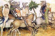 The upper class or nobility, represented chiefly by the Knight and his Squire, was in Chaucer's time steeped in a culture of chivalry and courtliness. Nobles were expected to be powerful warriors who could be ruthless on the battlefield, yet mannerly in the King's Court and Christian in their actions. Knights were expected to form a strong social bond with the men who fought alongside them, but an even stronger bond with a woman whom they idealized in order to strengthen their fighting ability. Though the aim of chivalry was to noble action, often its conflicting values degenerated into violence. Church leaders often tried to place restrictions on jousts and tournaments, which at times ended in the death of the loser. The Knight's Tale shows how the brotherly love of two fellow knights turns into a deadly feud at the sight of a woman whom both idealize, with both knights willing to fight the other to the death in order to win her. Chivalry was in Chaucer's day on the decline, and it is possible that The Knight's Tale was intended to show its flaws, although this is disputed. Chaucer himself had fought in the Hundred Years' War under Edward III, who heavily emphasized chivalry during his reign. Two tales, Sir Topas and The Tale of Melibee are told by Chaucer himself, who is travelling with the pilgrims in his own story. Both tales seem to focus on the ill-effects of chivalry—the first making fun of chivalric rules and the second warning against violence.