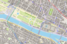 The Louvre is slightly askew of the axe historique (Historic Axis), a roughly eight-kilometre (five-mile) architectural line bisecting the city. It begins on the east in the Louvre courtyard and runs west along the Champs-Élysées. In 1871, the burning of the Tuileries Palace by the Paris Commune revealed that the Louvre was slightly askew of the Axe despite past appearances to the contrary. The Louvre can be reached by the Palais Royal – Musée du Louvre Métro or the Louvre-Rivoli stations.
