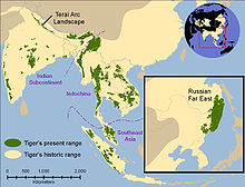 | Tiger's historic range in about 1850 (pale yellow) and in 2006 (in green). | |