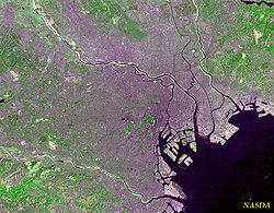 | Satellite photo of Tokyo's 23 Special wards taken by NASA's Landsat 7 | |||