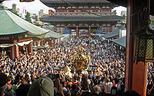 Many different festivals occur throughout Tokyo. Major events include the Sannō at Hie Shrine, the Sanja at Asakusa Shrine, and the biennial Kanda Festivals. The last features a parade with elaborately decorated floats and thousands of people. Annually on the last Saturday of July, an enormous fireworks display over the Sumida River attracts over a million viewers. Once cherry blossoms bloom in spring, many residents gather in Ueno Park, Inokashira Park, and the Shinjuku Gyoen National Garden for picnics under the blossoms.