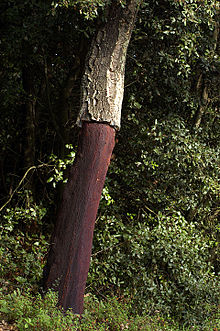 Cork is produced from the thick bark of the cork oak ( Quercus suber). It is harvested from the living trees about once every ten years in an environmentally sustainable industry. More than half the world's cork comes from Portugal and is largely used to make stoppers for wine bottles. Other uses include floor tiles, bulletin boards, balls, footwear, cigarette tips, packaging, insulation and joints in woodwind instruments.