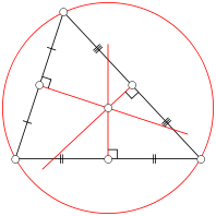 A perpendicular bisector of a triangle is a straight line passing through the midpoint of a side and being perpendicular to it, i.e. forming a right angle with it. The three perpendicular bisectors meet in a single point, the triangle's circumcenter; this point is the centre of the circumcircle, the circle passing through all three vertices. The diameter of this circle can be found from the law of sines stated above.