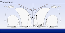 A hurricane or typhoon (sometimes simply referred to as a tropical cyclone, as opposed to a depression or storm) is a system with sustained winds of at least 33 metres per second (64 kn) or 74 miles per hour (119 km/h). A cyclone of this intensity tends to develop an eye, an area of relative calm (and lowest atmospheric pressure) at the centre of circulation. The eye is often visible in satellite images as a small, circular, cloud-free spot. Surrounding the eye is the eyewall, an area about 16 kilometres (9.9 mi) to 80 kilometres (50 mi) wide in which the strongest thunderstorms and winds circulate around the storm's centre. Maximum sustained winds in the strongest tropical cyclones have been estimated at about 85 metres per second (165 kn) or 195 miles per hour (314 km/h).