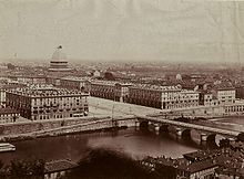 | A collage of Turin: in the top left is the Mole Antonelliana, followed by a view of the city under the snow, the Piazza Vittorio Veneto, the Royal Palace of Turin and the Museo del Risorgimento (Palazzo Carignano) | |||