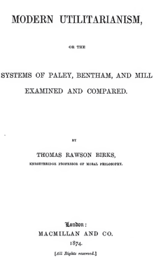 Gay's theological utilitarianism was developed and popularized by William Paley. It has been claimed that Paley was not a very original thinker and that the philosophical part of his treatise on ethics is "an assemblage of ideas developed by others and is presented to be learned by students rather than debated by colleagues." Nevertheless, his book The Principles of Moral and Political Philosophy (1785) was a required text at Cambridge and Smith says that Paley's writings were "once as well known in American colleges as were the readers and spellers of William McGuffey and Noah Webster in the elementary schools." Although now largely missing from the philosophical canon, Schneewind writes that "utilitarianism first became widely known in England through the work of William Paley." The now forgotten significance of Paley can be judged from the title of Birks's 1874 work Modern Utilitarianism or the Systems of Paley, Bentham and Mill Examined and Compared.