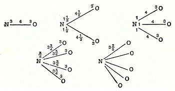 In 1789, William Higgins published views on what he called combinations of "ultimate" particles, which foreshadowed the concept of valency bonds. If, for example, according to Higgins, the force between the ultimate particle of oxygen and the ultimate particle of nitrogen were 6, then the strength of the force would be divided accordingly, and similarly for the other combinations of ultimate particles (see illustration).
