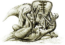 The "Fighting Dinosaurs" specimen, found in 1971, preserves a Velociraptor mongoliensis and Protoceratops andrewsi in combat and provides direct evidence of predatory behaviour. When originally reported, it was hypothesized that the two animals drowned. However, as the animals were preserved in ancient sand dune deposits, it is now thought that the animals were buried in sand, either from a collapsing dune or in a sandstorm. Burial must have been extremely fast, judging from the lifelike poses in which the animals were preserved. Parts of the Protoceratops are missing, which has been seen as evidence of scavenging by other animals. Comparisons between the scleral rings of Velociraptor, Protoceratops, and modern birds and reptiles indicates that Velociraptor may have been nocturnal, while Protoceratops may have been cathemeral, active throughout the day during short intervals, suggesting that the fight may have occurred at twilight or during low-light conditions.