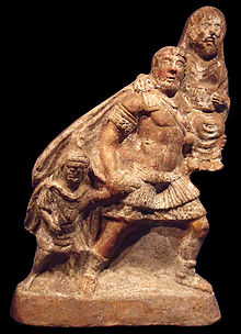 Book 1 (at the head of the Odyssean section) opens with a storm which Juno, Aeneas' enemy throughout the poem, stirs up against the fleet. The storm drives the hero to the coast of Carthage, which historically was Rome's deadliest foe. The queen, Dido, welcomes the ancestor of the Romans, and under the influence of the gods falls deeply in love with him. At a banquet in Book 2, Aeneas tells the story of the sack of Troy, the death of his wife, and his escape to the enthralled Carthaginians, while in Book 3 he recounts to them his wanderings over the Mediterranean in search of a suitable new home. Jupiter in Book 4 recalls the lingering Aeneas to his duty to found a new city, and he slips away from Carthage, leaving Dido to commit suicide, cursing Aeneas and calling down revenge in a symbolic anticipation of the fierce wars between Carthage and Rome. In Book 5, Aeneas' father Anchises dies and funeral games are celebrated for him. On reaching Cumae, in Italy in Book 6, Aeneas consults the Cumaean Sibyl, who conducts him through the Underworld where Aeneas meets the dead Anchises who reveals his Rome's destiny to his son.