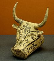 The Protoliterate period in Mesopotamia, dominated by Uruk, saw the production of sophisticated works like the Warka Vase and cylinder seals. The Guennol Lioness is an outstanding small limestone figure from Elam of about 3000–2800 BC, part man and part lion. A little later there are a number of figures of large-eyed priests and worshippers, mostly in alabaster and up to a foot high, who attended temple cult images of the deity, but very few of these have survived. Sculptures from the Sumerian and Akkadian period generally had large, staring eyes, and long beards on the men. Many masterpieces have also been found at the Royal Cemetery at Ur (c. 2650 BC), including the two figures of a Ram in a Thicket, the Copper Bull and a bull's head on one of the Lyres of Ur.