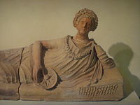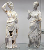 The subsequent Minoan and Mycenaean cultures developed sculpture further, under influence from Syria and elsewhere, but it is in the later Archaic period from around 650 BCE that the kouros developed. These are large standing statues of naked youths, found in temples and tombs, with the kore as the clothed female equivalent, with elaborately dressed hair; both have the " archaic smile". They seem to have served a number of functions, perhaps sometimes representing deities and sometimes the person buried in a grave, as with the Kroisos Kouros. They are clearly influenced by Egyptian and Syrian styles, but the Greek artists were much more ready to experiment within the style.