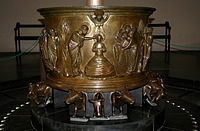 Much surviving prehistoric art is small portable sculptures, with a small group of female Venus figurines such as the Venus of Willendorf (24,000–22,000 BC) found across central Europe; the 30 cm tall Lion man of the Hohlenstein Stadel of about 30,000 BCE has hardly any pieces that can be related to it. The Swimming Reindeer of about 11,000 BCE is one of the finest of a number of Magdalenian carvings in bone or antler of animals in the art of the Upper Paleolithic, though they are outnumbered by engraved pieces, which are sometimes classified as sculpture. With the beginning of the Mesolithic in Europe figurative sculpture greatly reduced, and remained a less common element in art than relief decoration of practical objects until the Roman period, despite some works such as the Gundestrup cauldron from the European Iron Age and the Bronze Age Trundholm sun chariot.