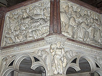 A basic distinction is between sculpture in the round, free-standing sculpture, such as statues, not attached (except possibly at the base) to any other surface, and the various types of relief, which are at least partly attached to a background surface. Relief is often classified by the degree of projection from the wall into low or bas-relief, high relief, and sometimes an intermediate mid-relief. Sunk-relief is a technique restricted to Ancient Egypt. Relief is the usual sculptural medium for large figure groups and narrative subjects, which are difficult to accomplish in the round, and is the typical technique used both for architectural sculpture, which is attached to buildings, and for small-scale sculpture decorating other objects, as in much pottery, metalwork and jewellery. Reliefs may also decorate steles, upright slabs, usually of stone, which contain sculpture or sometimes just inscriptions.
