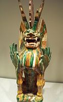 Towards the end of the long Neolithic Jōmon period, some pottery vessels were "flame-rimmed" with extravagant extensions to the rim that can only be called sculptural, and very stylized pottery dogū figures were produced, many with the characteristic "snow-goggle" eyes. During the Kofun period of the 3rd to 6th century CE, haniwa terracotta figures of humans and animals in a simplistic style were erected outside important tombs. The arrival of Buddhism in the 6th century brought with it sophisticated traditions in sculpture, Chinese styles mediated via Korea. The 7th century Hōryū-ji and its contents have survived more intact than any East Asian Buddhist temple of its date, with works including a Shaka Trinity of 623 in bronze, showing the historical Buddha flanked by two bodhisattvas and also the Guardian Kings of the Four Directions.