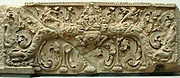 Islam is famously aniconic, so the vast majority of sculpture is arabesque decoration in relief or openwork, based on vegetable motifs, but tending to geometrical abstract forms. In the very early Mshatta Facade (740s), now mostly in Berlin, there are animals within the dense arabesques in high relief, and figures of animals and men in mostly low relief are found in conjunction with decoration on many later pieces in various materials, including metalwork, ivory and ceramics.